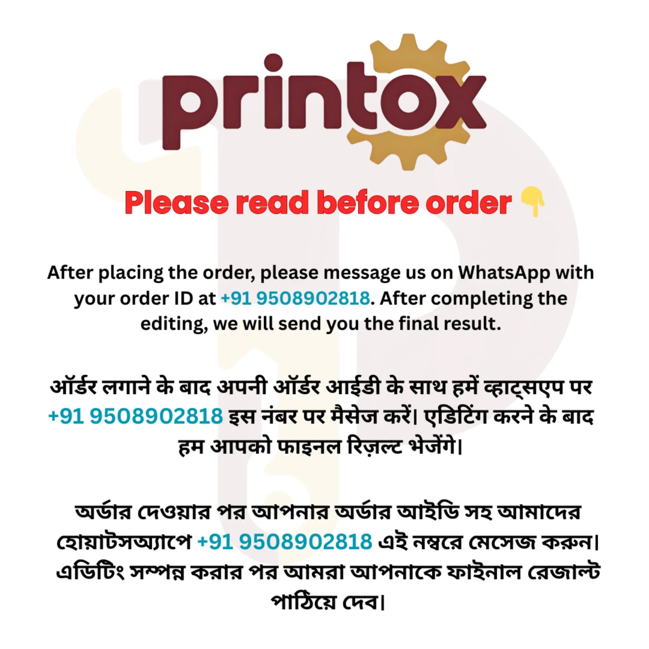 After placing your order, please WhatsApp us your Order ID along with the photos you want printed on the mug at +91 9508902818. Our design team will create the final mug design and share it with you for approval before printing.