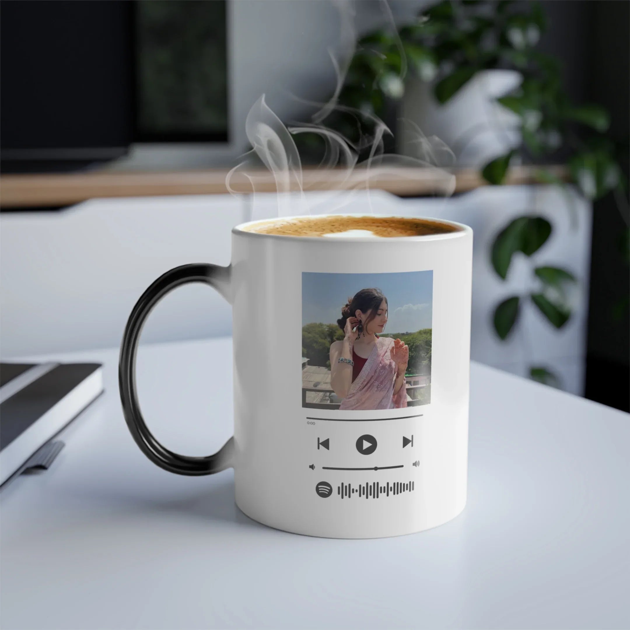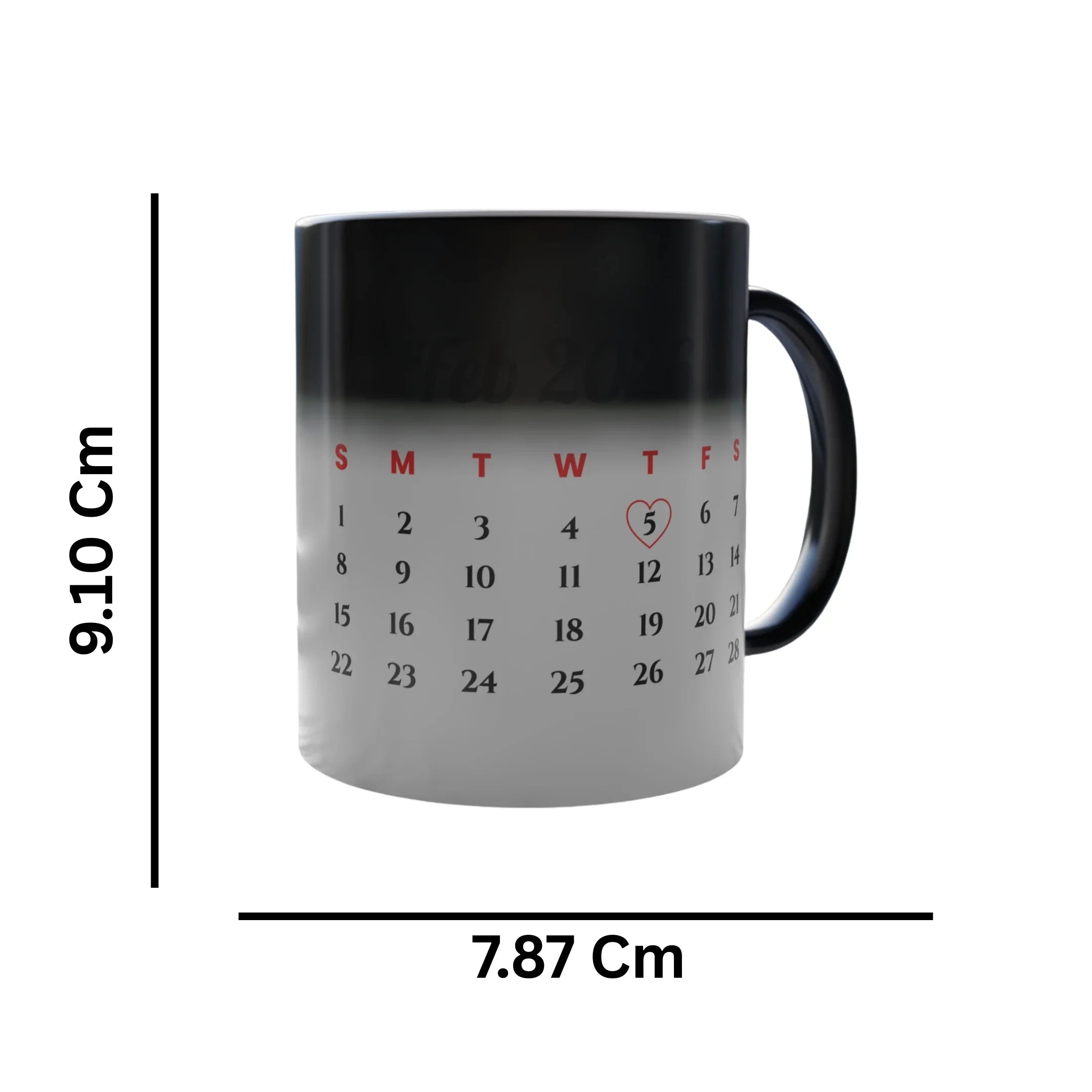 Pour in hot tea, coffee, milk, or hot water, and watch the magic happen — your custom calendar design and photo appear automatically, highlighting your special date in a stylish and meaningful way. As the mug cools down, it smoothly returns to its black color, hiding the design again.