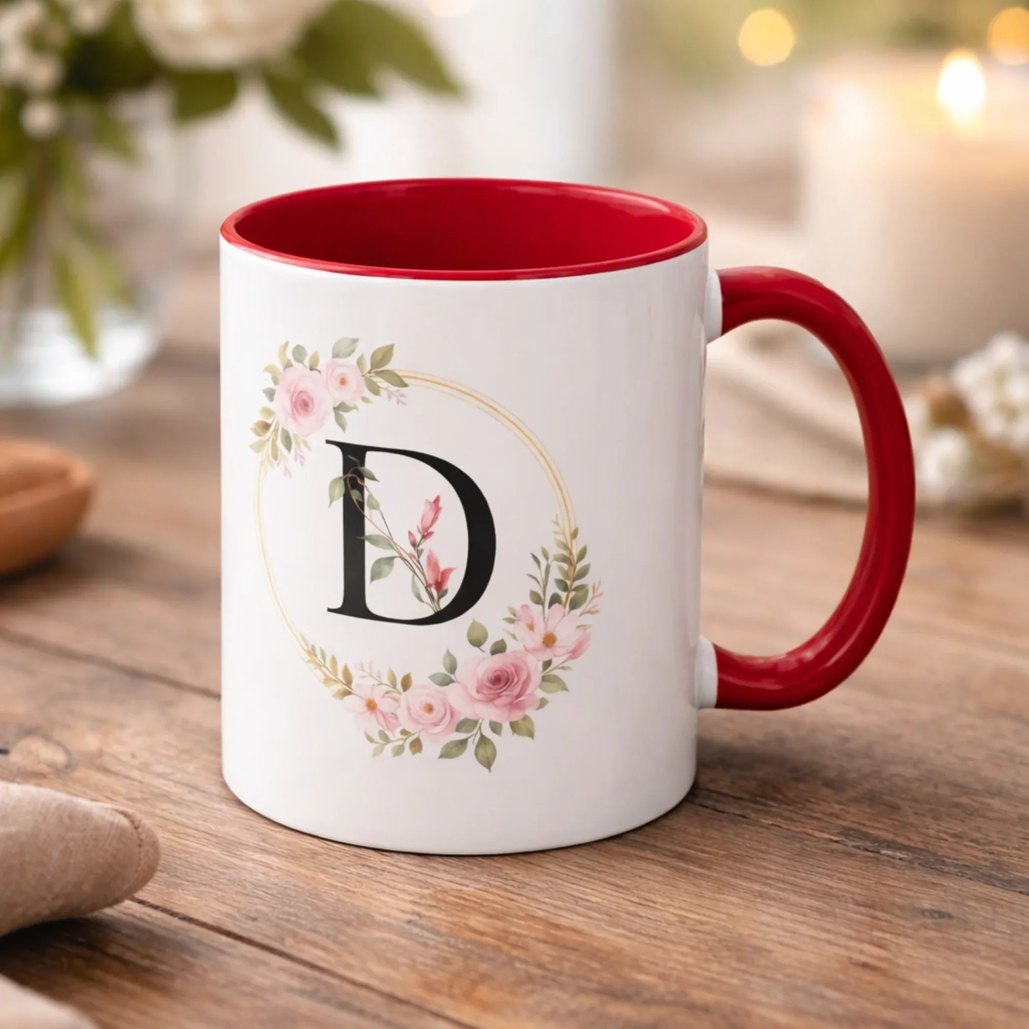 Add a personal touch to your everyday beverage with this Premium Inner Color Ceramic Mug, beautifully designed with a floral wreath and an elegant Letter “D” print. Crafted from high-quality ceramic, this mug features a glossy white exterior paired with a rich colored inner surface and handle, giving it a stylish and modern appeal.